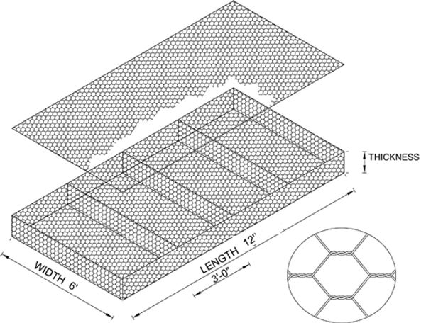 PRO-FLEXMATS™ Reno Mattresses are low profile mattress shaped wire mesh containers constructed of double twisted woven galvanized steel wire mesh and manufactured to ASTM A975-97 standards. The compartments or cells of the reno mattress are of equal size and dimension and are formed by internal diaphragms being placed within the basket providing even distribution of the stone fill throughout the mattress even after structural movement. Even distribution of the stone fill ensures that the
